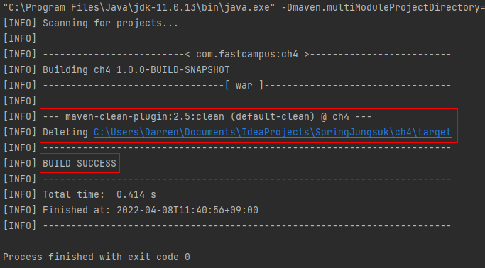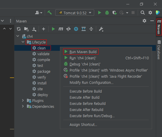 우측 탭에 Maven → 프로젝트 선택 → Lifecycle → clean → 우측 마우스 → Run Maven Build