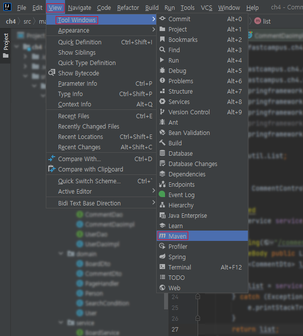 상단 탭에 View -> Tool Windows -> Maven 클릭