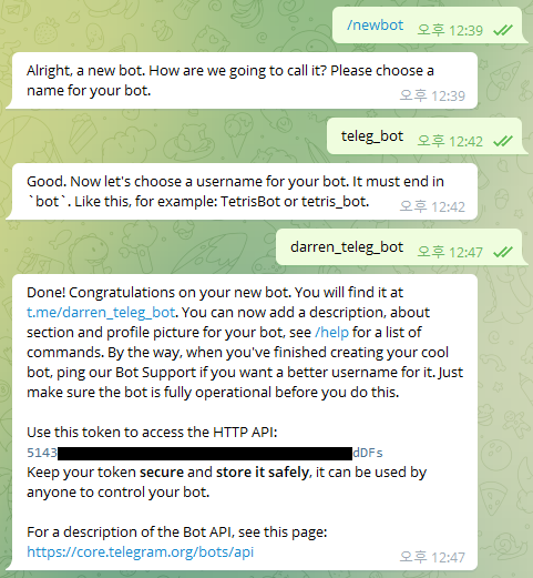 Bot 생성이 끝나면 위에 가려놓은 부분에 token key가 주어집니다.
