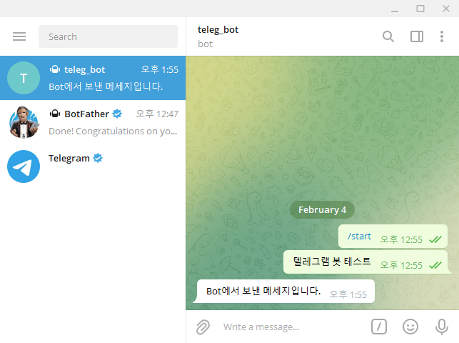 7. 이제 본인 텔레그램 계정으로 메세지를 전송해보겠습니다.