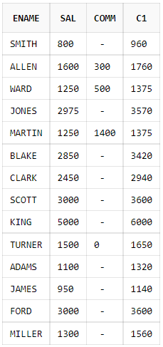 SELECT ename, sal, comm, sal + (sal * NVL2(comm, 0.1, 0.2)) AS c1 FROM emp;