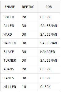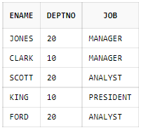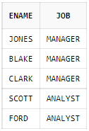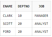 SELECT ename, deptno, job FROM emp WHERE (deptno, job) IN((10, 'MANAGER'), (20, 'ANALYST'));