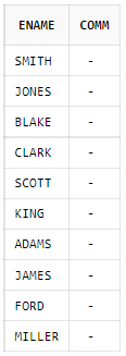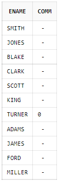 SELECT ename, comm FROM emp WHERE LNNVL(comm <> 0);