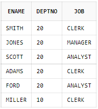 SELECT ename, deptno, job FROM emp WHERE ( job = 'CLERK' AND deptno = 10) OR deptno = 20; |