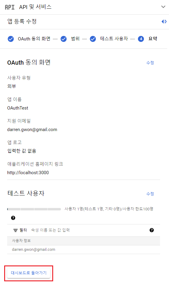 7. OAuth 동의 화면은 이걸로 마쳤습니다.