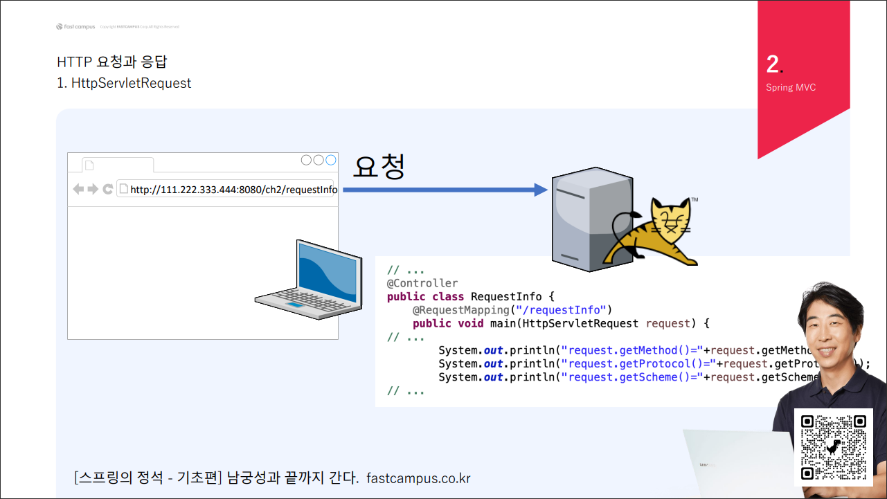 요청과 함께 전송된 데이터를 request객체에 담아 매서드의 매개변수로 제공을 해준다.