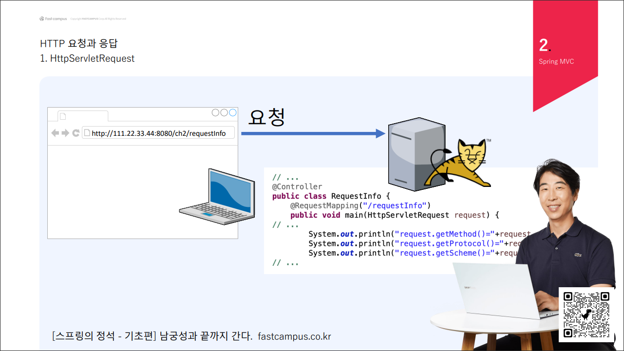 이때 톰캣에서 HttpServletRequest 객체를 생성하여 요청에 포함된 데이터들을 담아 매개변수로 제공한다.